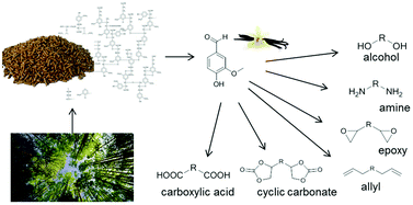 Vanillin was used as a renewable building-block to develop a platform of 22 biobased compounds for polymer chemistry. Vanillin-derived biobased monomers bearing epoxy, cyclic carbonates, allyl, amine, alcohol and carboxylic acid moieties were synthesized. They can be used, among many others, in epoxy, polyester, polyurethanes, and Non-Isocyanate PolyUrethanes (NIPU) polymer synthesis. The epoxy-functionalized compounds were synthesized under solvent-free conditions and are original biobased aromatic epoxy monomers. Cyclic carbonates were prepared through a catalytic reaction between epoxy compounds and CO2. Thiol–ene reactions allowed the functionalization of allylated compounds with amines, acids and alcohols. The amine-functionalized compounds are, to our knowledge, the first non-aliphatic biobased amine hardeners, usable either in epoxy or NIPU materials.