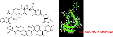 Petriellin A is a novel cyclic depsipeptide antifungal compound consisting of nine L-configured residues, one D-phenyllactic acid (PhLac) and three unknown chiral centres: two N-methyl-threonines (MeThr1 & MeThr2) and one N-methyl-isoleucine (MeIle). NMR experiments including 2D ROESY, NOESY along with structural and energy calculations predicted that the unknown chiral centres were all L-configured, which was later verified chemically. Simulated annealing, dynamics calculations and minimisation processes showed Petriellin A to have a folded “C-shaped” structure.