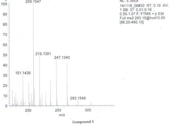 The theoretical mass of [M + H]+ is 283.1545 amu. The high-resolution mass spectrum shows the [M + H]+ at m/z = 283.1557 amu. This measured mass is consistent with the [M + H]+formula C15H22O5 within an deviation of 4.2 ppm. (amu: atomic mass unit)