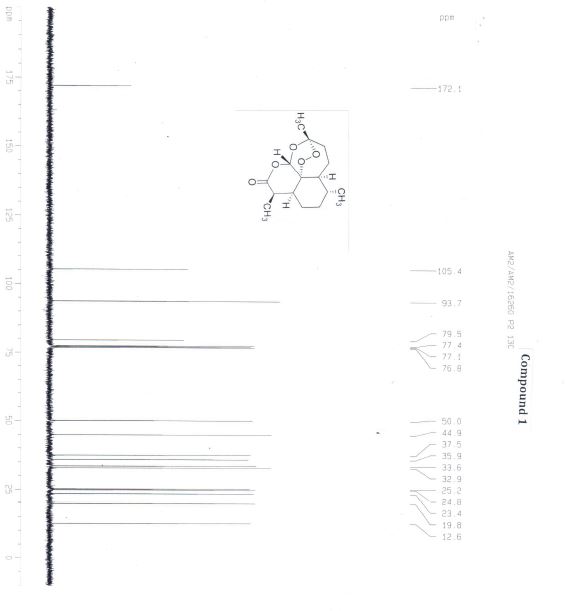 The melting point of artemisinin batch 1 (AM2/AM2/16260 P2) was found to be 152.6–153.7 °C, and that of batch 2 (AM2/AM2/16260 Crop II) was 153–154 °C.(53)