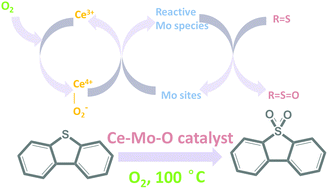 A Ce–Mo–O catalyst prepared by a simple sol–gel method was proved to be highly active for aerobic oxidative desulfurization. Almost complete conversions of dibenzothiophene and 4,6-dimethyldibenzothiophene were achieved without any additional sacrificial agent at 100 °C and atmospheric pressure, and the conversion of benzothiophene could reach 97%. Reusability of the catalyst was also conducted, and >99% conversions could be achieved in three consecutive runs. As supported by carefully-designed control experiments, oxygen was activated by Ce species in the catalyst first, forming some reactive oxygen species, which oxidized DBT into DBTO2 with the assistance of Mo species. Furthermore, selective quenching experiments indicated the generation of superoxide species during the reaction.