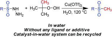 A copper-catalyzed S-methylation of sulfonyl hydrazides with TBHP was efficiently developed, providing a variety of methyl sulfones with good to excellent yields. The reaction can be carried out in water smoothly without any ligand or additive under mild conditions and this catalyst-in-water can be recycled several times.