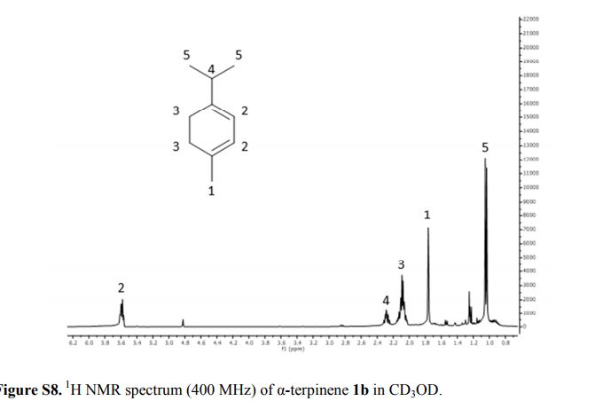 Ascaridole δ: 1.03 (d, J = 6.9, H9, H10), 1.39 (s, H7), 1.52 (d, J = 9.0, H5), 1.91 (sept, J = 6.9, H8), 2.07 (d, J = 9.0, H6), 6.43 (d, J = 8.7, H3), 6.51 (d, J = 8.7, H2). http://www.scielo.br/scielo.php?script=sci_arttext&pid=S0102-695X2016000100056