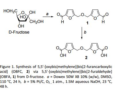 D-Fructose was converted to the dialdehyde 5,5′-[oxybis(methylene)]bis[2-furaldehyde] by heating at 110 °C in DMSO with the Dowex 50 W X8 solid acid catalyst in 76% yield without the isolation of the intermediate 5-hydroxymethylfurfural. This dialdehyde was then converted to the dicarboxylic acid monomer, 5,5′-[oxybis(methylene)]bis[2-furancarboxylic acid], using oxygen (1 atm.) and 5% Pt/C catalyst in 1.5 M aqueous NaOH at room temperature in 98% yield. The new dicarboxylic acid monomer can be considered as a renewable resource based alternative to terephthalic acid as demonstrated by the preparation of polyesters with 1,2-ethanediol and 1,4-butanediol in 87–92% yield.